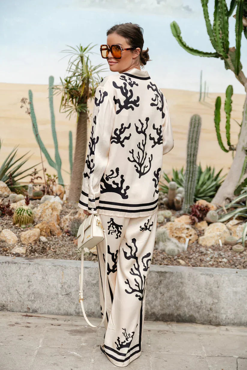 Con su camisa de manga larga con solapa y sus pantalones largos de corte ancho, este conjunto ofrece un equilibrio perfecto entre estilo y comodidad. Hecho en una composición de poliéster y algodón, es la opción perfecta para esos días en los que quieres ir elegante y cómoda