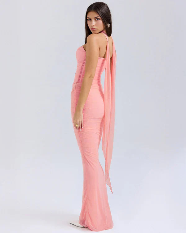 Nuestro conjunto «Malu» reinterpreta la silueta clásica de malla en un diseño moderno de tres piezas: corsé, falda maxi y bufanda a juego. Confeccionado en suave malla elástica, combina la estructura romántica del corsé con la fluidez de la falda fruncida de talle medio y cremallera lateral oculta. La bufanda ligera añade un toque versátil y elegante para un look sofisticado y atemporal.